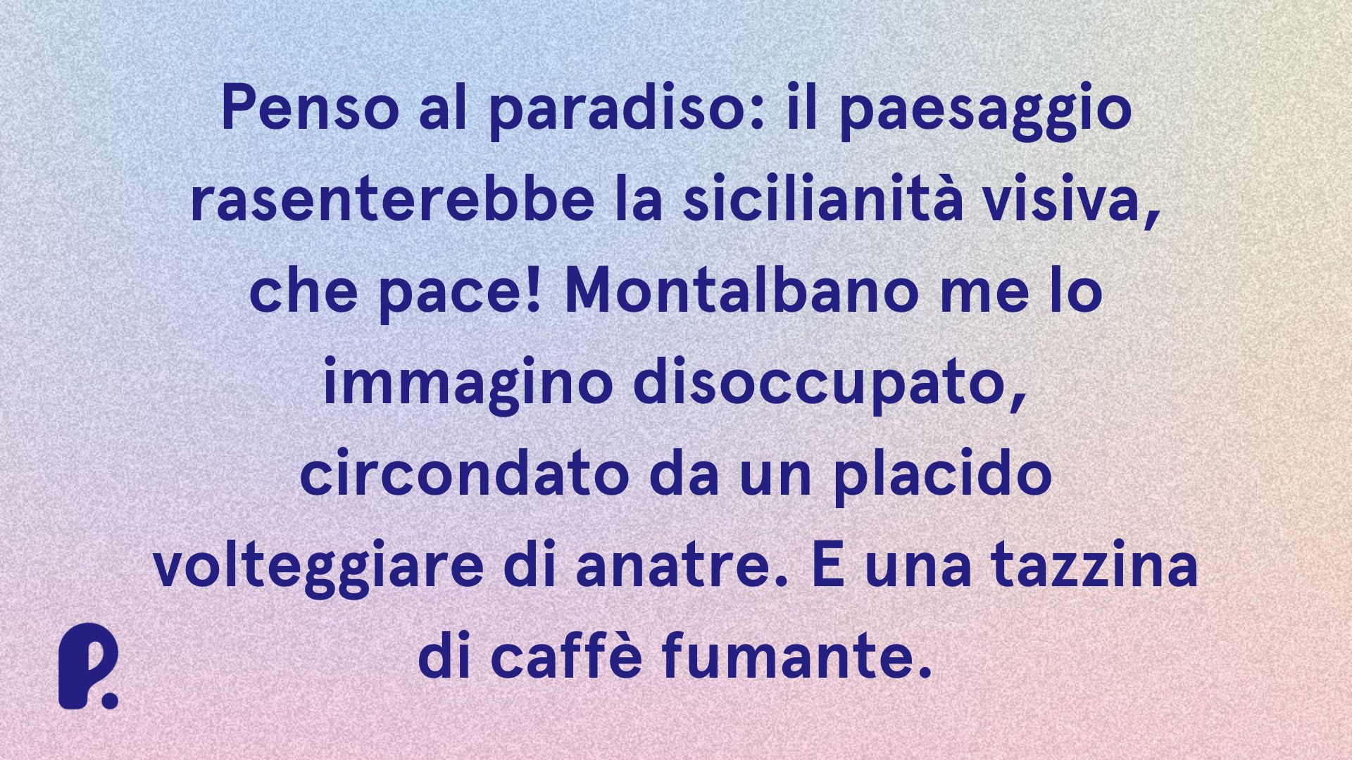 - "Se mentre mangi con gusto non hai allato a tia una pirsona che mangia con pari gusto allora il piaciri del mangiare è come offuscato, diminuito." (da La prima indagine di Montalbano)